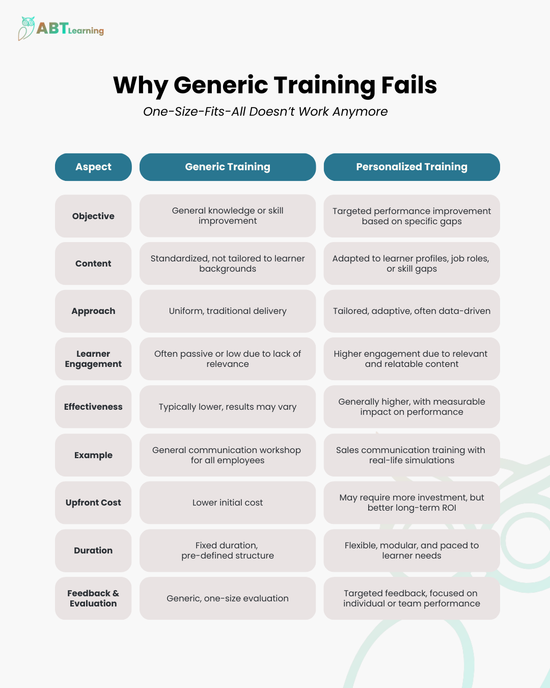 The comparison below highlights the fundamental flaws of generic training—and why personalization matters more than ever: