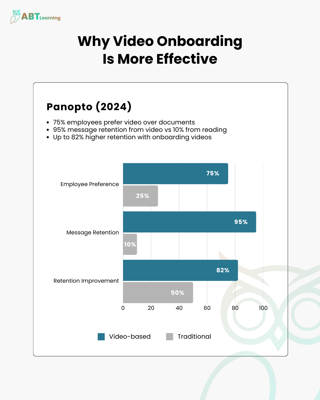 Multiple studies highlight that video-based onboarding significantly improves knowledge retention. According to Panopto, employees are 75% more likely to watch a video than read documents, and organizations that use onboarding videos have seen retention rates increase by up to 82%.