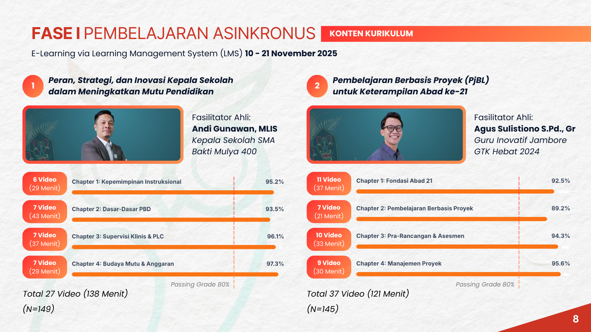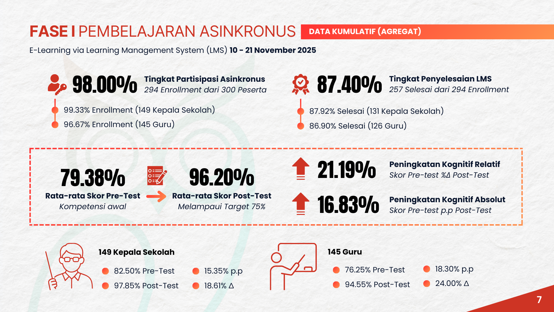 - Tingkat Partisipasi Tinggi: Dari target awal, 98% peserta aktif mengikuti seluruh rangkaian pembelajaran asinkronus.