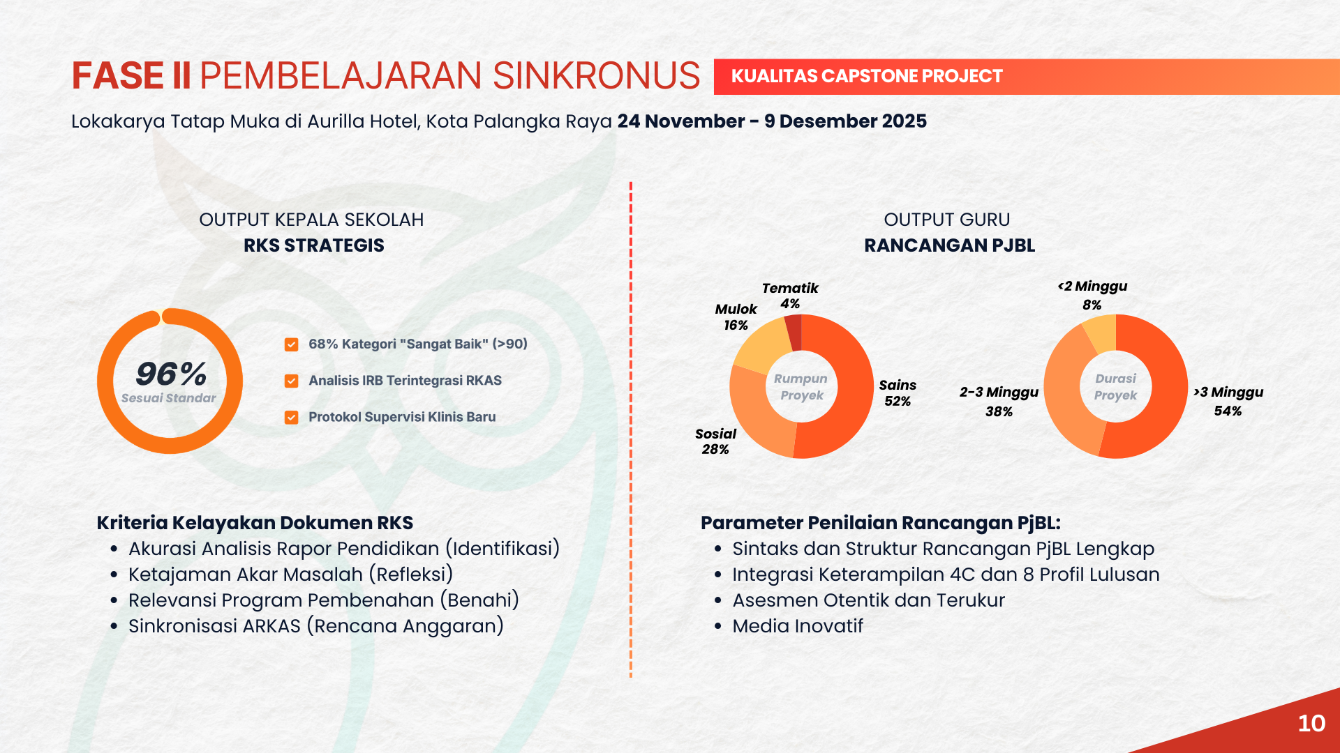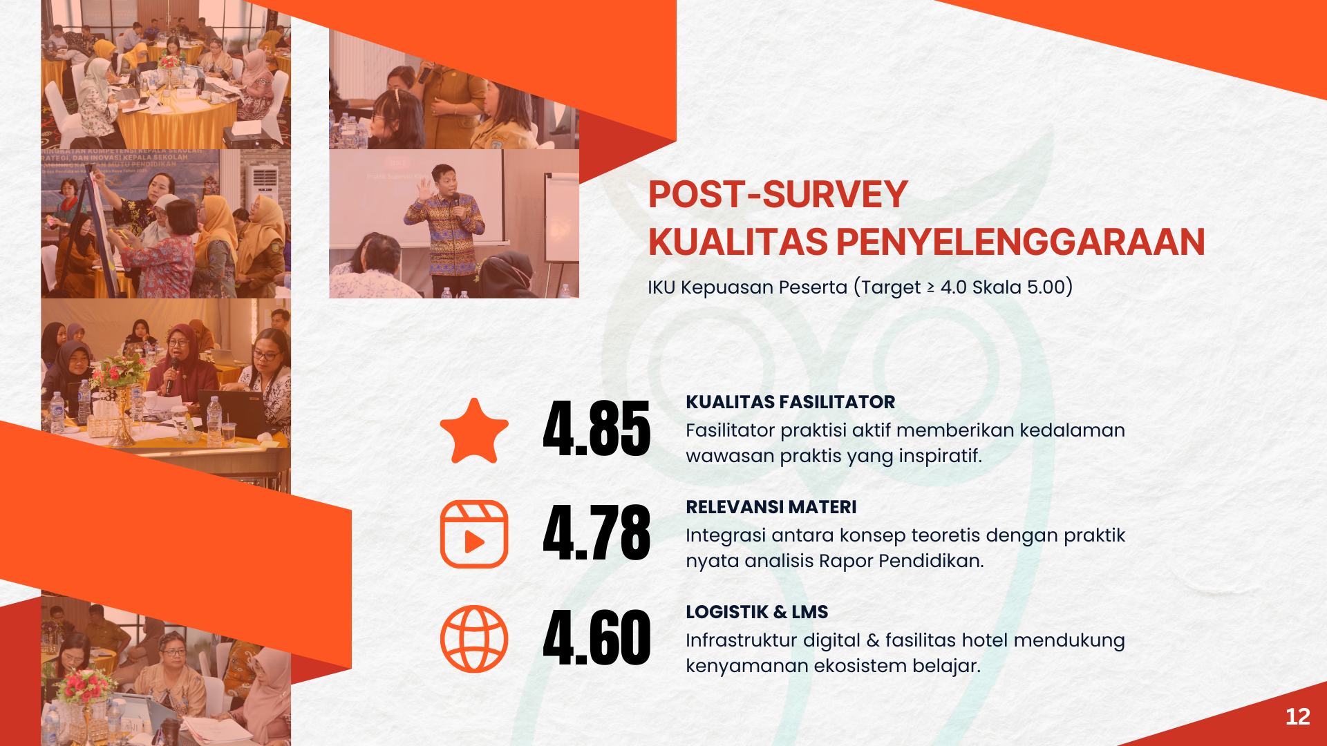 - Kepala Sekolah (Kepemimpinan Berbasis Data): Menghasilkan dokumen Rencana Kerja Sekolah (RKS) yang strategis. Hasilnya, 96% dokumen RKS yang disusun peserta dinilai "Sesuai Standar", dengan 68% di antaranya masuk kategori "Sangat Baik".