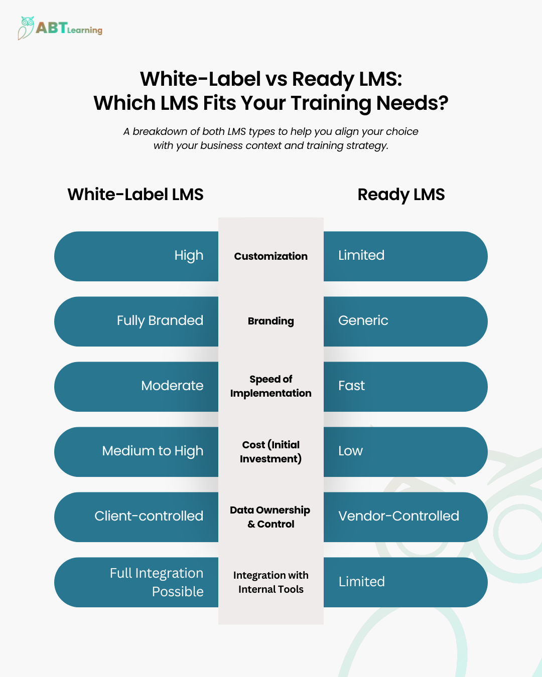 To make an informed decision, it helps to break down both LMS types across key dimensions that matter most to your business. The following table highlights the major differences between a ready-to-use LMS and a white-label LMS: